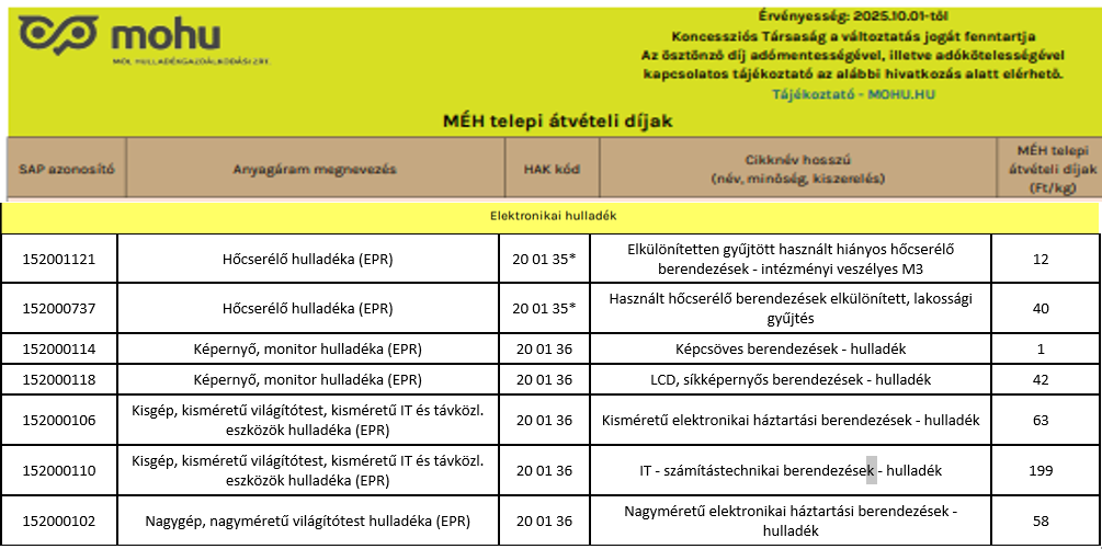A megadott díjak az SZJA Törvény 58.§ (10) alapján fémkereskedelmi engedélyköteles anyag (fémhulladék) átadása esetén az SZJA (3,75%) levonása után kerülnek kifizetésre.